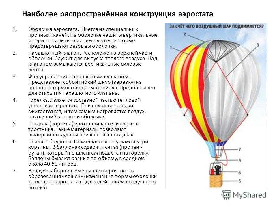 Наиболее распространённая конструкция аэростата 1.Оболочка аэростата. Шьется из специальных прочных тканей. На оболочке нашиты вертикальные и горизонтальные силовые ленты, которые предотвращают разрывы оболочки. 2.Парашютный клапан. Расположен в верхней части оболочки. Служит для выпуска теплого воздуха. Над клапаном замыкаются вертикальные силовые ленты. 3.Фал управления парашютным клапаном. Представляет собой гибкий шнур (веревку) из прочного термостойкого материала. Предназначен для открытия парашютного клапана. 4.Горелка. Является составной частью тепловой установки аэростата. При помощи горелки сжигается газ, и тем самым нагревается воздух, находящийся внутри оболочки. 5.Гондола (корзина) изготавливается из лозы и тростника. Такие материалы позволяют выдерживать удары при жестких посадках. 6.Газовые баллоны. Размещаются по углам внутри корзины. В баллонах содержится газ (пропан — бутан), который по шлангам подается на горелку. Баллоны бывают разные по объему, в среднем около литров. 7.Воздухозаборник. Уменьшает вероятность образования «ложек» (изменение формы оболочки теплового аэростата под воздействием воздушного потока).