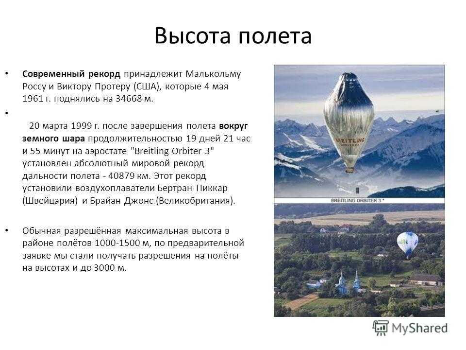 Высота полета Современный рекорд принадлежит Малькольму Россу и Виктору Протеру (США), которые 4 мая 1961 г. поднялись на м. 20 марта 1999 г. после завершения полета вокруг земного шара продолжительностью 19 дней 21 час и 55 минут на аэростате «Breitling Orbiter 3» установлен абсолютный мировой рекорд дальности полета км. Этот рекорд установили воздухоплаватели Бертран Пиккар (Швейцария) и Брайан Джонс (Великобритания). Обычная разрешённая максимальная высота в районе полётов м, по предварительной заявке мы стали получать разрешения на полёты на высотах и до 3000 м.