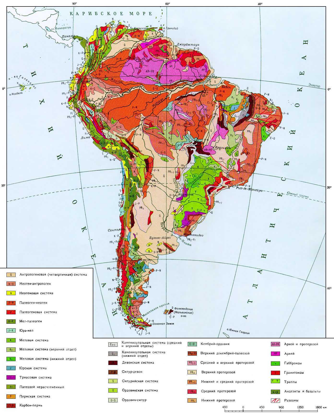 По характеру геологического строения и особенностям современного рельефа Южную Америку можно разделить разделена на две разнородные части. Восток представлена древней, докембрийской Южно-Американской платформой. Запад – активно развивающийся с начала палеозоя складчатый пояс Анд.