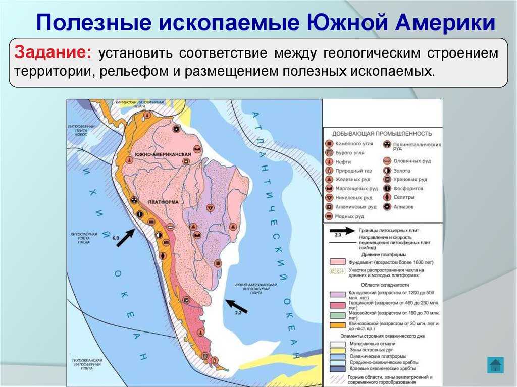 Недра Южной Америки богаты полезными ископаемыми. Их распространение в пределах материка тесно связано с геологическим строением. Богатейшие запасы железных руд приурочены к древним щитам платформы – центр и окраины Бразильского нагорья и север Гвианского нагорья.