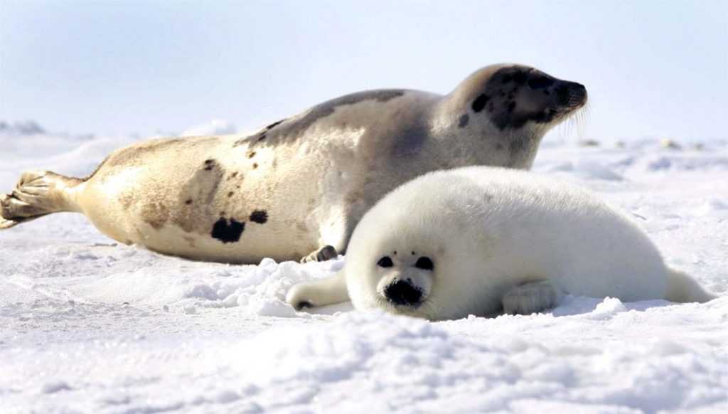 Селится в арктических водах. Длина тела составляет до 180 см, а вес – до 140 кг. Детеныш гренландского тюленя зовется «белец». Он имеет белую шерсть, которая потом сменяется серой и гладкой. Мама ухаживает за бельком примерно три недели, после чего уходит. Тюлень питается ракообразными и рыбой. Способен нырнуть на глубину до 200 м. Отлично плавает и может преодолеть многие сотни километров.