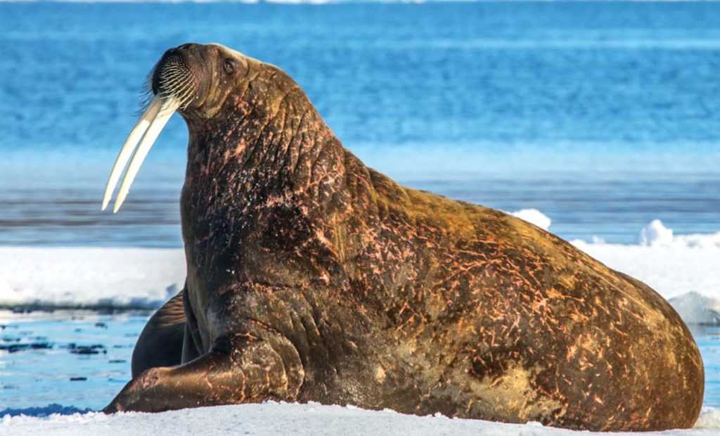 Бивни помогают моржу выбираться на лед из воды и держаться за его кромку