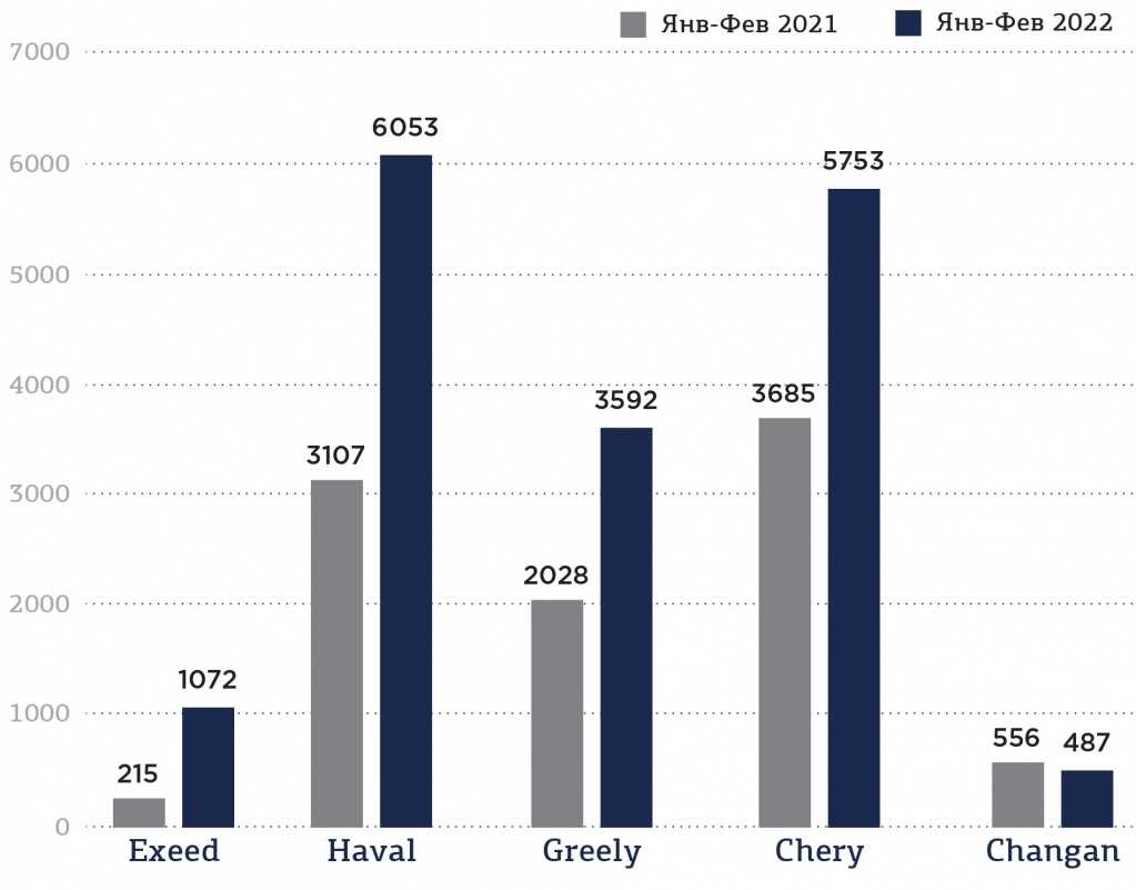 Другие китайские марки (Chery и EXEED) хоть временно прекратили закупку автомобилей для России в феврале из-за нестабильности рубля, все-таки возобновили производство и на российском рынке остались. В России Chery торгует кроссоверами Tiggo 8 Pro, Tiggo 8, Tiggo 7 Pro и Tiggo 4. По данным АЕБ, в феврале было продано 2907 машин этой марки (+45%).