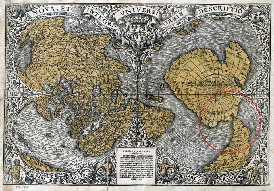 На старинной карте мира отлично видно, что никакого пролива Дрейка в 1531 году ещё нет… Или о нём ещё неизвестно, и картограф рисует карту по старым сведениям.