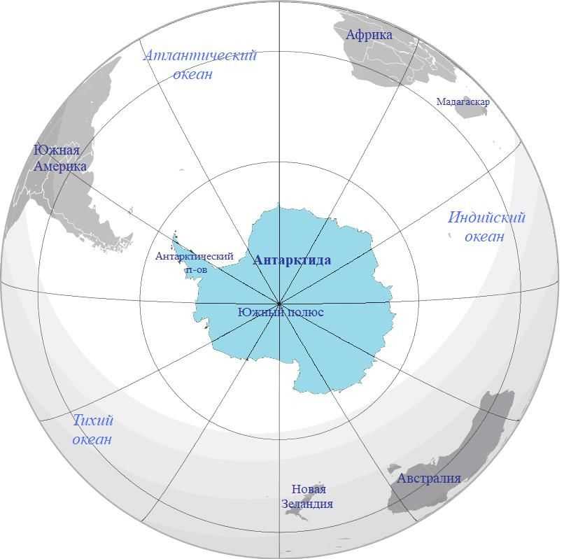 Рис. 1. Расположение Антарктиды на глобусе. Вид со стороны Южного полюса (по )
