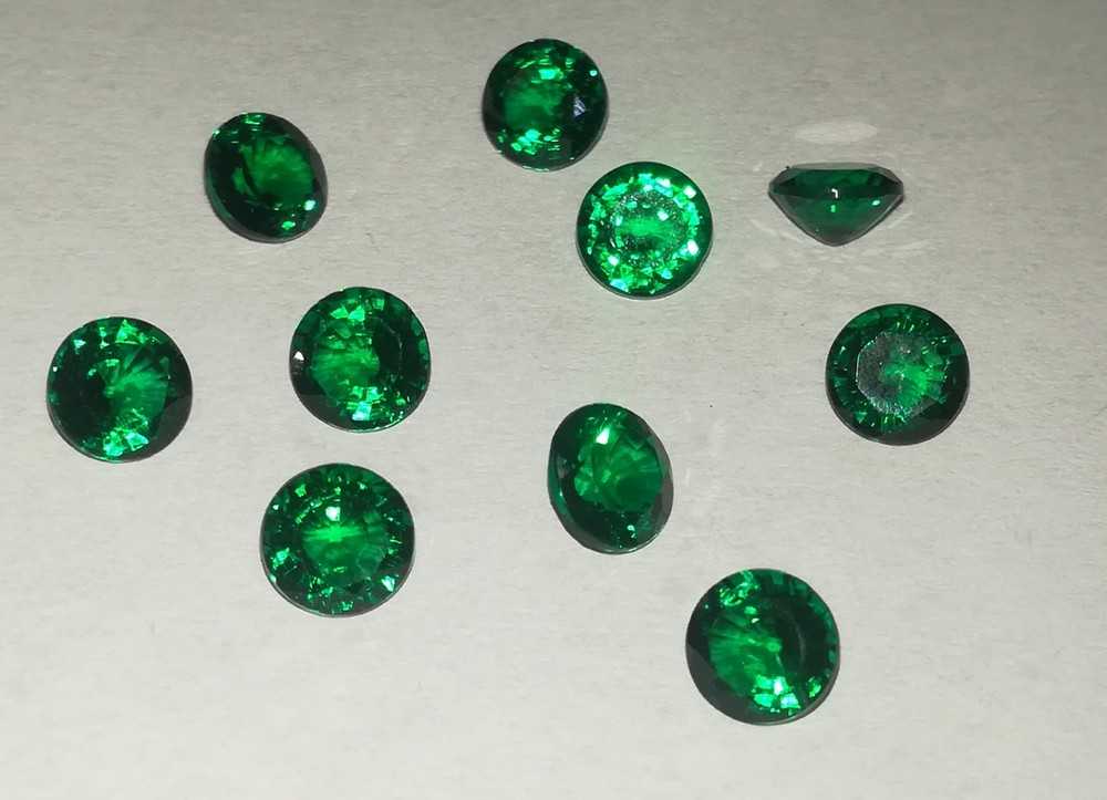Искусственные камни внешне похожи на природные, но значительно хуже преломляют свет. Обычно они окрашены в насыщенный зеленый с голубым оттенком, наминают редкий колумбийский сорт. При использовании фильтра Челси камни воспринимаются ярко-красными (намного краснее природных экземпляров).