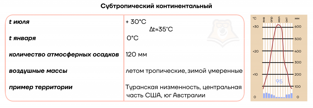 - Добавим также большую амплитуду. Зимой температуры могут опускаться немного ниже 0°C, летом могут достигать +40°C в среднем.