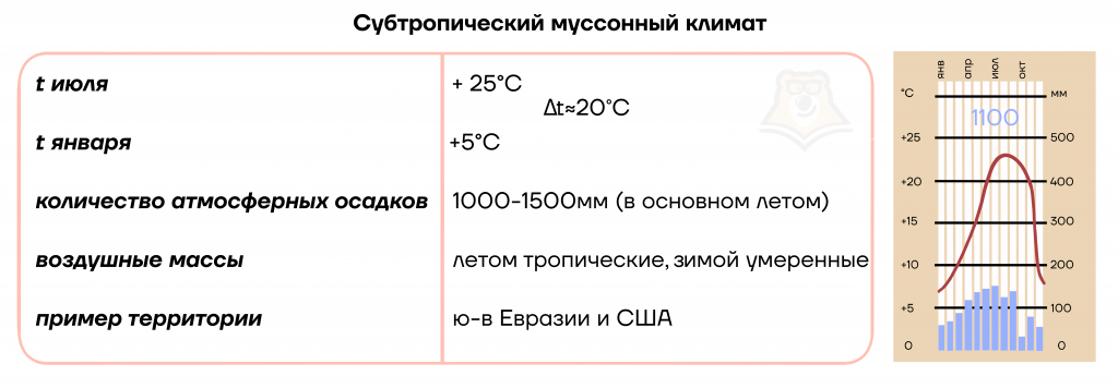 Помните муссон? Это особые ветра, с океана на материк. Для них выделен целый подтип, где они диктуют свои условия климата.