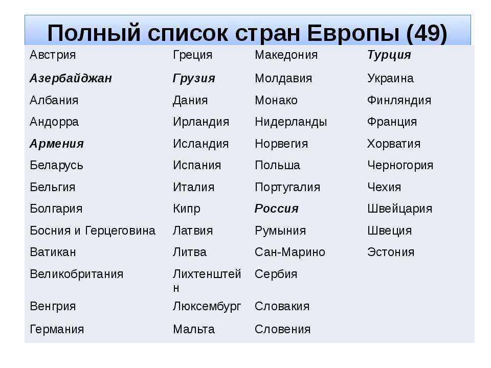 Перечень стран Западной Европы