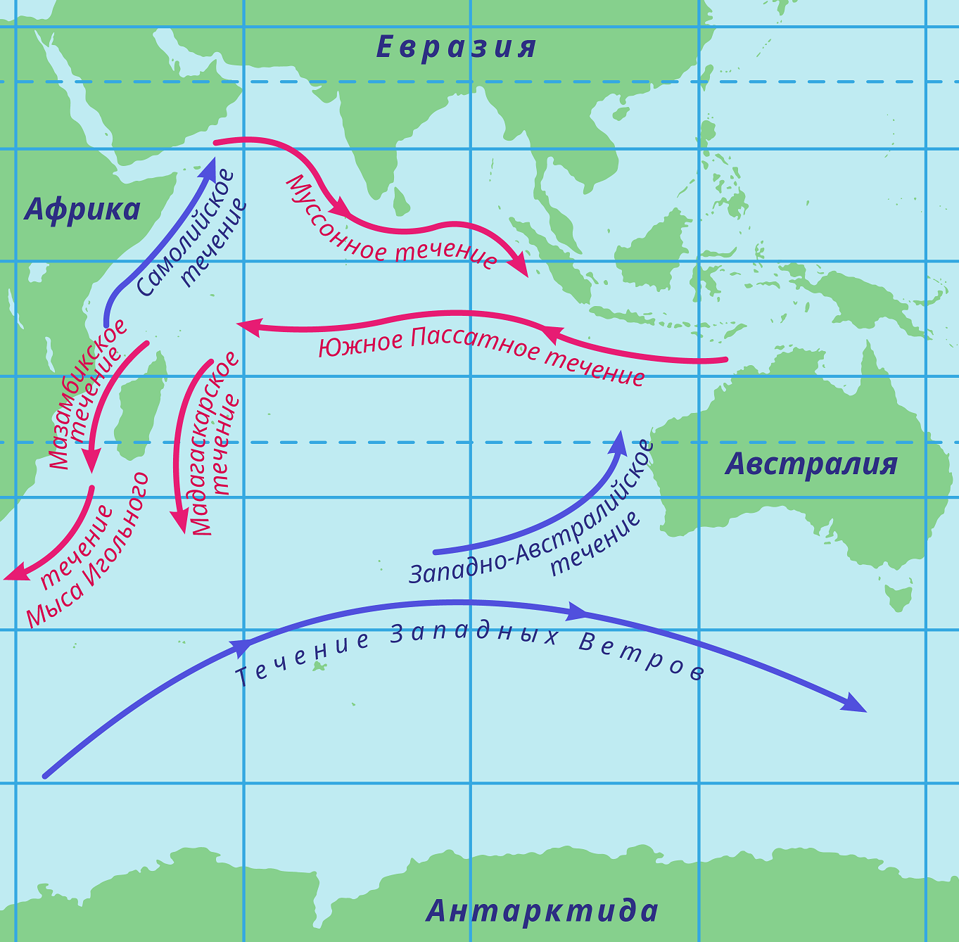Особенность Индийского океана — изменчивые течения в его северной части. Они подчинены муссонам — ветрам, которые меняют направление в зависимости от сезона.