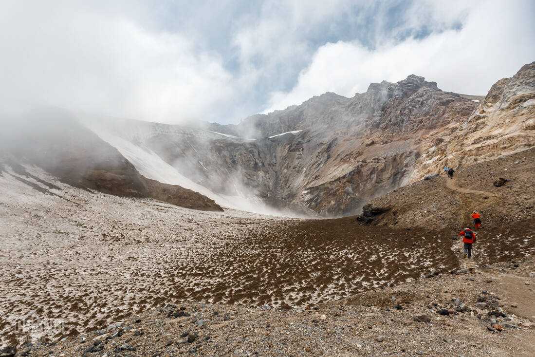 Восхождение: С его вершины открывается потрясающий вид на океан и все именитые вулканы Мутновско-Гореловской группы. Но насладиться зрелищем смогут лишь туристы, с хорошей физической подготовкой. На восхождение нужно брать и «кошки» и полотенце, почти любой треккинг завершаете купанием в Верхне-Паратунских термальных источниках.
