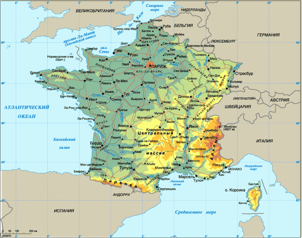 Где находится европейская территория Франции по отношению к странам-соседям, можно увидеть на картах Европы или мира.
