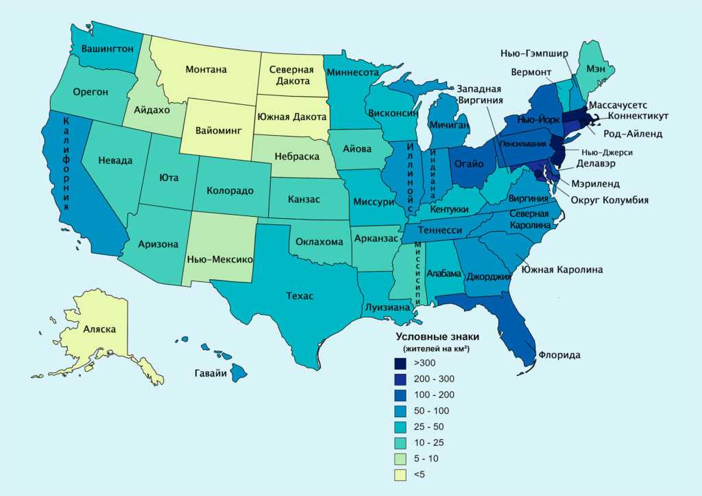 Если посмотреть на карту средней плотности размещения жителей США, можно увидеть, что максимально плотно заселены восточная часть, Атлантическое и Тихоокеанское побережья. Гораздо меньшей плотностью отличаются центральные штаты.