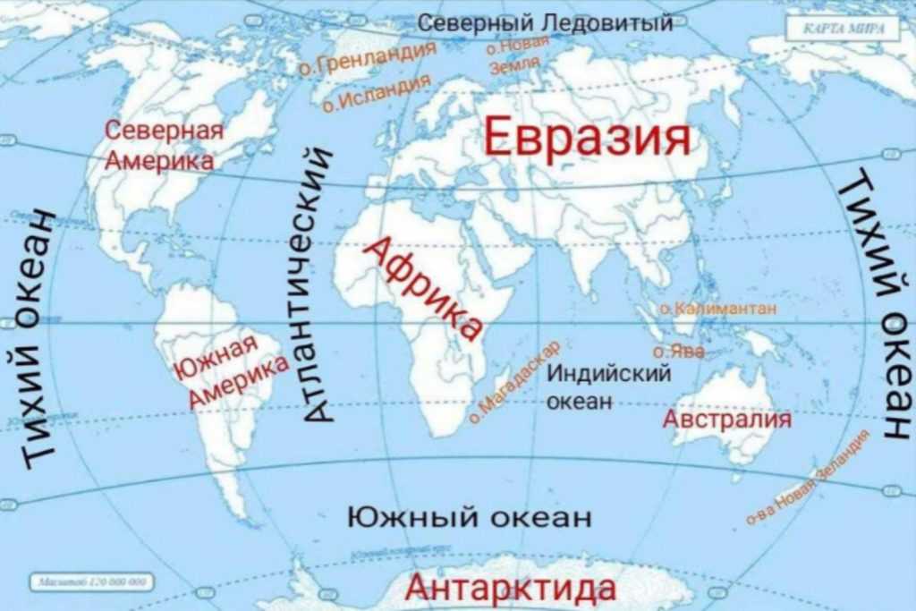 Воды Мирового океана неоднородны и разделены на 4 океана. Границы океанов пролегают по окраинам суши. Очень хорошо это просматривается на карте Мирового океана. Познакомимся с границами океанов на карте.
