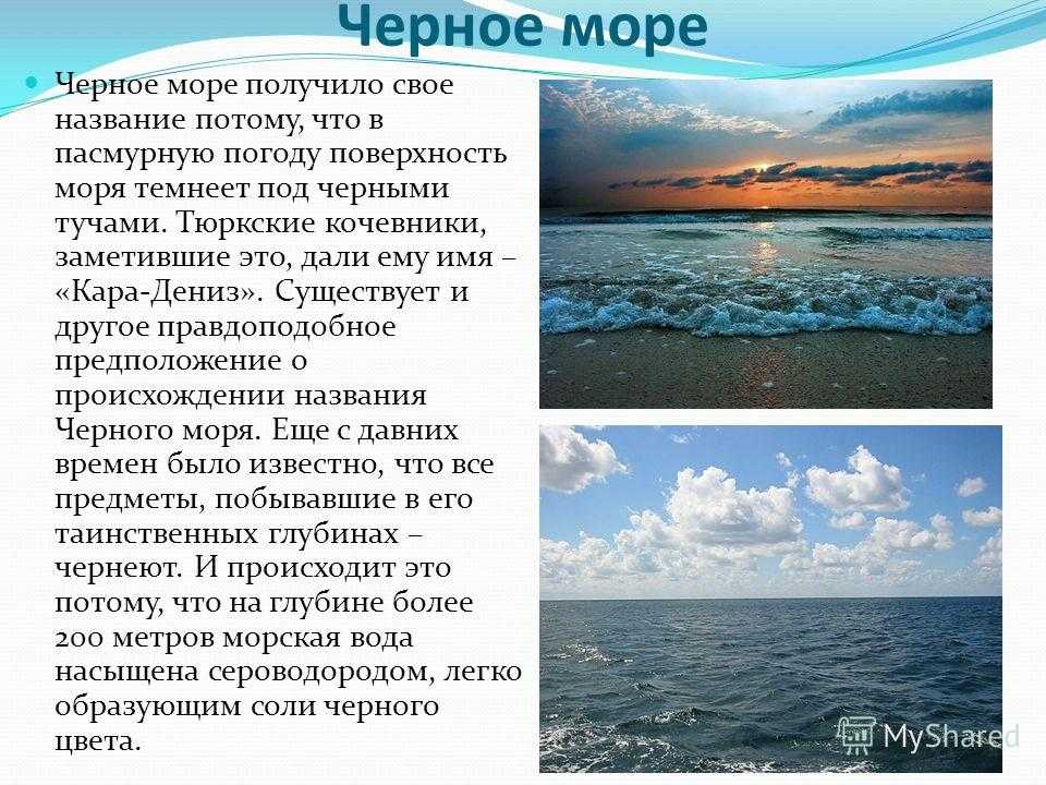 Черное море Черное море получило свое название потому, что в пасмурную погоду поверхность моря темнеет под черными тучами. Тюркские кочевники, заметившие это, дали ему имя – «Кара-Дениз». Существует и другое правдоподобное предположение о происхождении названия Черного моря. Еще с давних времен было известно, что все предметы, побывавшие в его таинственных глубинах – чернеют. И происходит это потому, что на глубине более 200 метров морская вода насыщена сероводородом, легко образующим соли черного цвета.