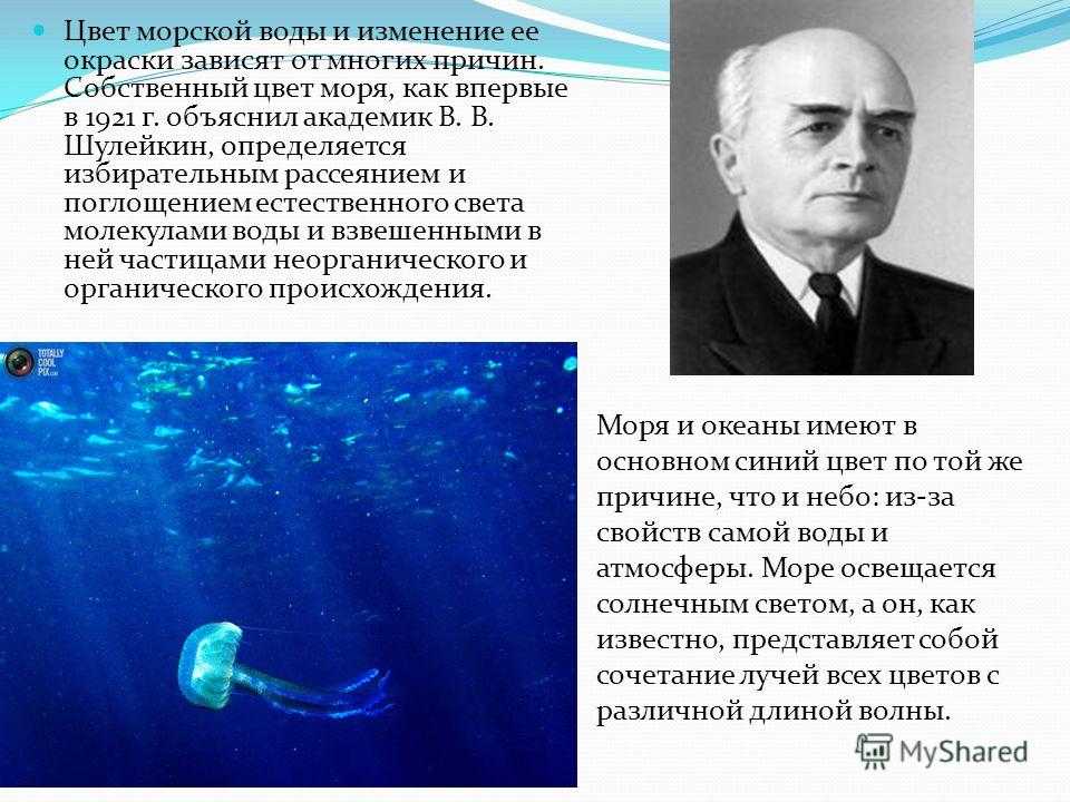 Цвет морской воды и изменение ее окраски зависят от многих причин. Собственный цвет моря, как впервые в 1921 г. объяснил академик В. В. Шулейкин, определяется избирательным рассеянием и поглощением естественного света молекулами воды и взвешенными в ней частицами неорганического и органического происхождения. Моря и океаны имеют в основном синий цвет по той же причине, что и небо: из-за свойств самой воды и атмосферы. Море освещается солнечным светом, а он, как известно, представляет собой сочетание лучей всех цветов с различной длиной волны.