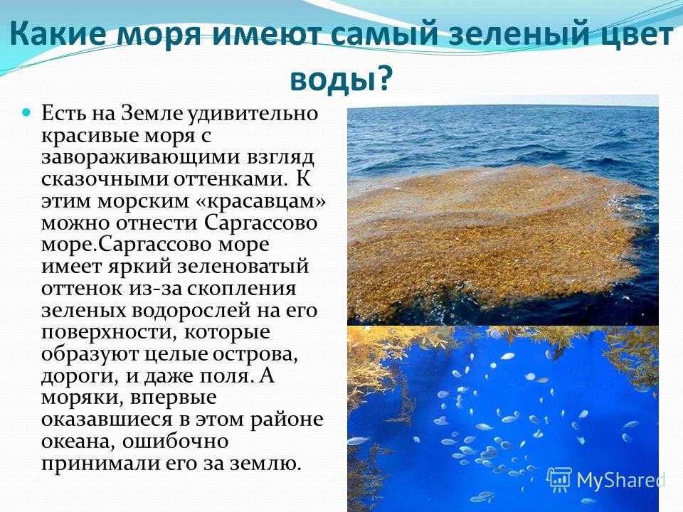 Какие моря имеют самый зеленый цвет воды? Есть на Земле удивительно красивые моря с завораживающими взгляд сказочными оттенками. К этим морским «красавцам» можно отнести Саргассово море.Саргассово море имеет яркий зеленоватый оттенок из-за скопления зеленых водорослей на его поверхности, которые образуют целые острова, дороги, и даже поля. А моряки, впервые оказавшиеся в этом районе океана, ошибочно принимали его за землю.