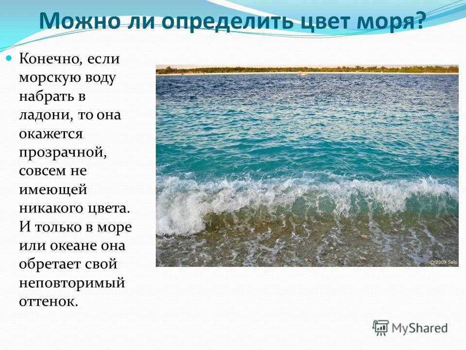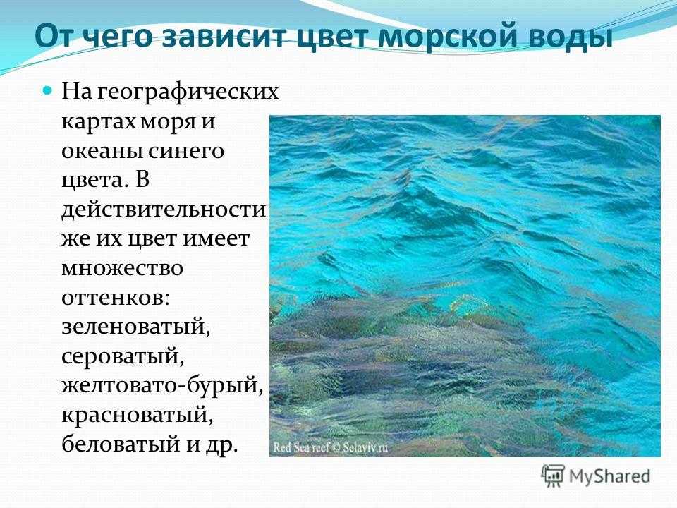 От чего зависит цвет морской воды На географических картах моря и океаны синего цвета. В действительности же их цвет имеет множество оттенков: зеленоватый, сероватый, желтовато-бурый, красноватый, беловатый и др.