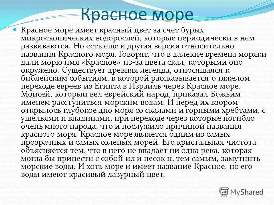 Красное море Красное море имеет красный цвет за счет бурых микроскопических водорослей, которые периодически в нем развиваются. Но есть еще и другая версия относительно названия Красного моря. Говорят, что в далекие времена моряки дали морю имя «Красное» из-за цвета скал, которыми оно окружено. Существует древняя легенда, относящаяся к библейским событиям, в которой рассказывается о тяжелом переходе евреев из Египта в Израиль через Красное море. Моисей, который вел еврейский народ, приказал Божьим именем расступиться морским водам. И перед их взором открылось глубокое дно моря со скалами и горными хребтами, с ущельями и впадинами, при переходе через которые погибло очень много народа, что и послужило причиной названия красного моря. Красное море является одним из самых прозрачных и самых соленых морей. Его кристальная чистота объясняется тем, что в него не впадает ни одна река, которая могла бы принести с собой ил и песок и, тем самым, замутнить морские воды. И хоть море и имеет название Красное, но его воды имеют красивый лазурный цвет.