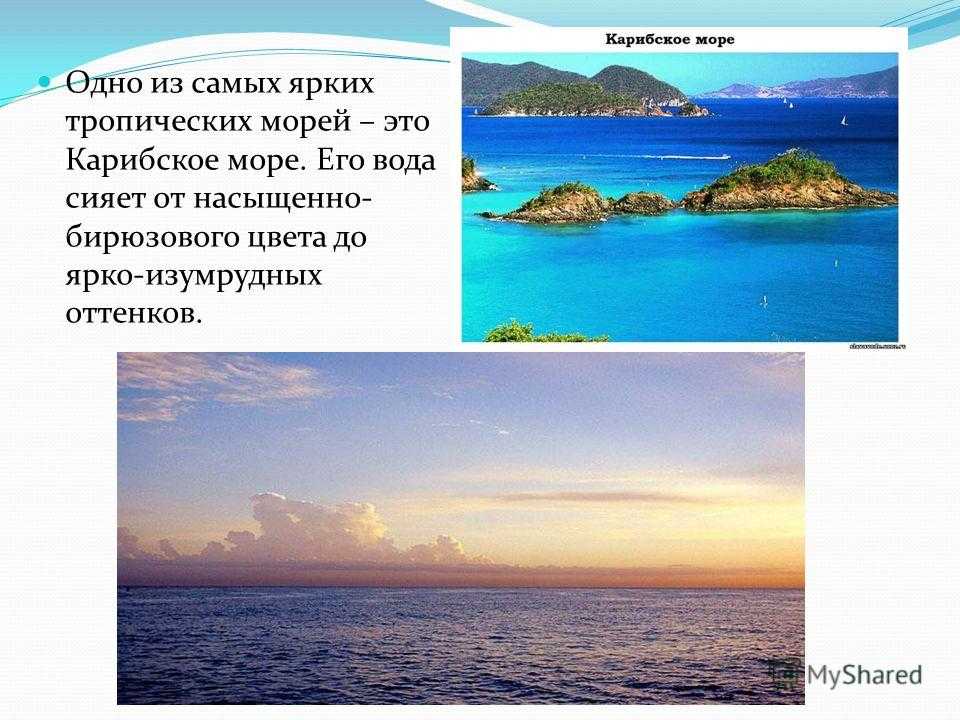 Одно из самых ярких тропических морей – это Карибское море. Его вода сияет от насыщенно- бирюзового цвета до ярко-изумрудных оттенков.