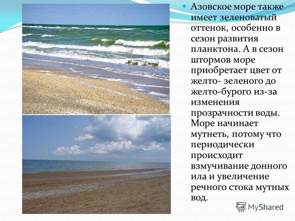 Азовское море также имеет зеленоватый оттенок, особенно в сезон развития планктона. А в сезон штормов море приобретает цвет от желто- зеленого до желто-бурого из-за изменения прозрачности воды. Море начинает мутнеть, потому что периодически происходит взмучивание донного ила и увеличение речного стока мутных вод.
