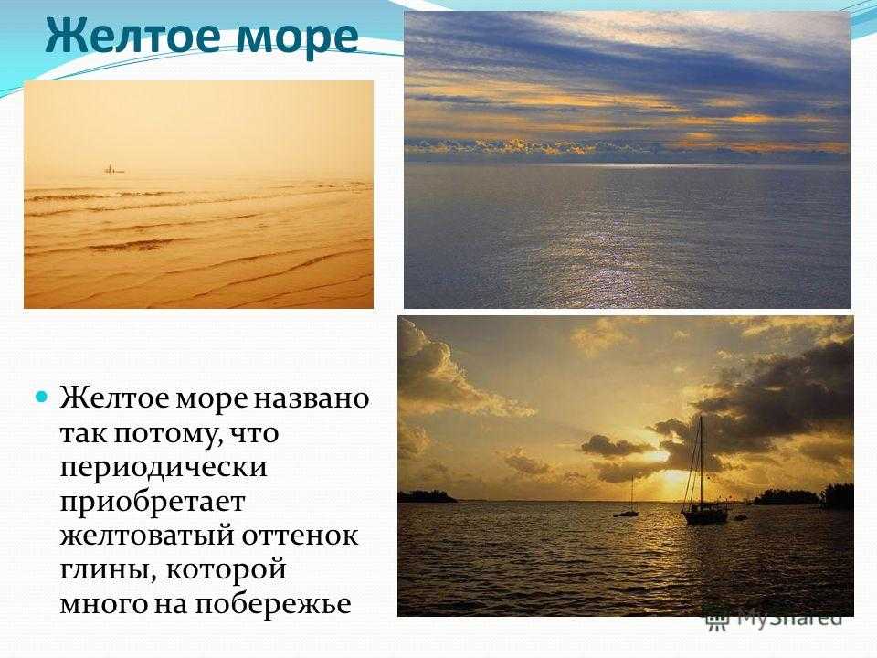 Желтое море Желтое море названо так потому, что периодически приобретает желтоватый оттенок глины, которой много на побережье