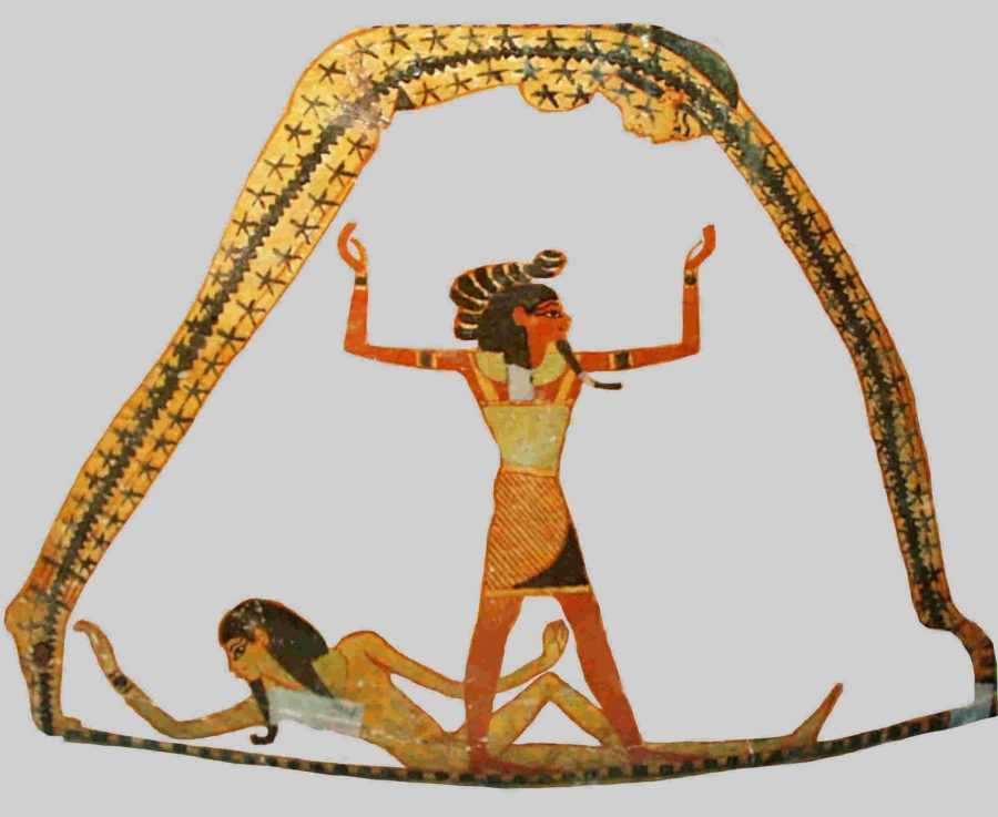 Бог земли – Геб и богиня неба – Нут очень любили друг друга, и поэтому вначале наша Вселенная была слита воедино. Каждый вечер Нут рождала звезды, которые появлялись на небе. Каждое утро перед восходом солнца она проглатывала их. И так продолжалось изо дня в день, из года в год, пока Геб не начал раздражаться, из-за чего назвал Нут свиньей, которая поедает своих поросят. Тогда вмешался бог солнца – Ра и позвал бога ветра – Шу для того, чтобы он разделил небо и землю. Так Нут вознеслась на небо в виде коровы. Иногда на помощь своему мужу Шу приходила Технуд, но она очень быстро уставала поддерживать небесную корову и начинала плакать, а ее слезы падали дождем на землю.