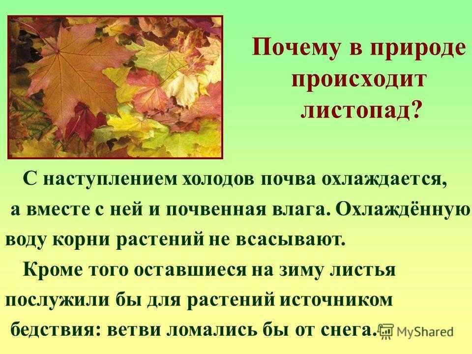 Почему в природе происходит листопад? С наступлением холодов почва охлаждается, а вместе с ней и почвенная влага. Охлаждённую воду корни растений не всасывают. Кроме того оставшиеся на зиму листья послужили бы для растений источником бедствия: ветви ломались бы от снега.