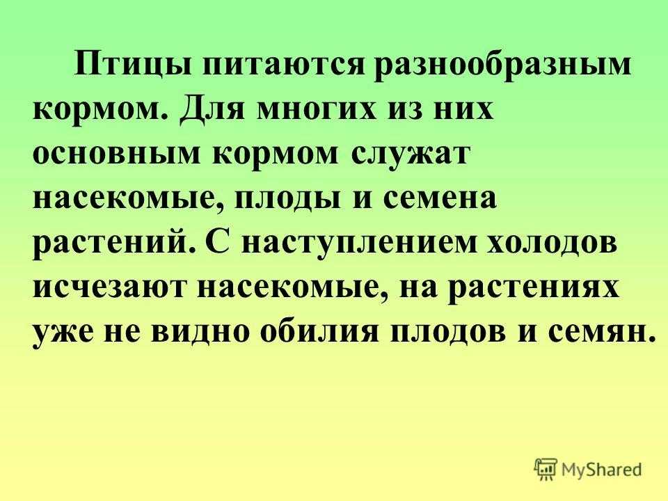 Птицы питаются разнообразным кормом. Для многих из них основным кормом служат насекомые, плоды и семена растений. С наступлением холодов исчезают насекомые, на растениях уже не видно обилия плодов и семян.