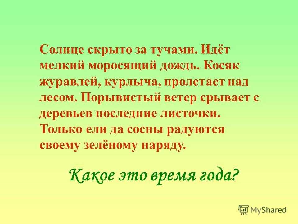 Солнце скрыто за тучами. Идёт мелкий моросящий дождь. Косяк журавлей, курлыча, пролетает над лесом. Порывистый ветер срывает с деревьев последние листочки. Только ели да сосны радуются своему зелёному наряду. Какое это время года?