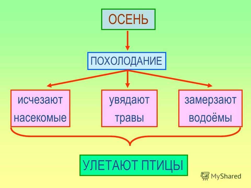 ОСЕНЬ ПОХОЛОДАНИЕ исчезают насекомые увядают травы замерзают водоёмы УЛЕТАЮТ ПТИЦЫ