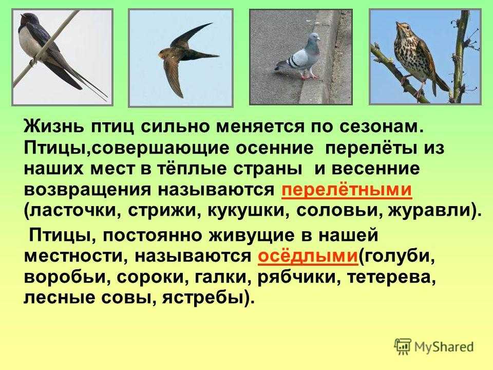 Жизнь птиц сильно меняется по сезонам. Птицы,совершающие осенние перелёты из наших мест в тёплые страны и весенние возвращения называются перелётными (ласточки, стрижи, кукушки, соловьи, журавли). Птицы, постоянно живущие в нашей местности, называются осёдлыми(голуби, воробьи, сороки, галки, рябчики, тетерева, лесные совы, ястребы).
