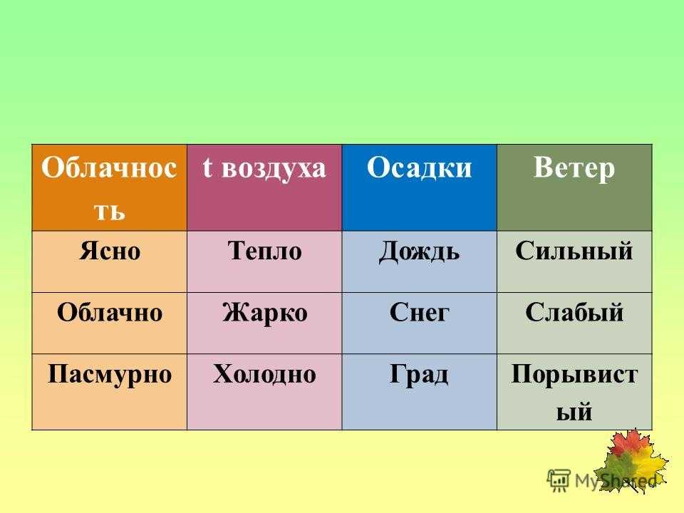 Облачнос ть t воздухаОсадкиВетер ЯсноТеплоДождьСильный ОблачноЖаркоСнегСлабый ПасмурноХолодноГрадПорывист ый