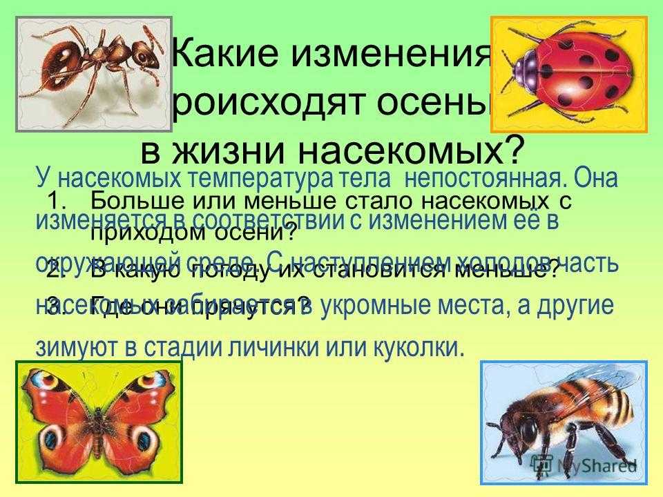 Какие изменения происходят осенью в жизни насекомых? 1.Больше или меньше стало насекомых с приходом осени? 2.В какую погоду их становится меньше? 3.Где они прячутся? У насекомых температура тела непостоянная. Она изменяется в соответствии с изменением её в окружающей среде. С наступлением холодов часть насекомых забирается в укромные места, а другие зимуют в стадии личинки или куколки.