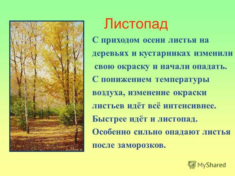 Листопад С приходом осени листья на деревьях и кустарниках изменили свою окраску и начали опадать. С понижением температуры воздуха, изменение окраски листьев идёт всё интенсивнее. Быстрее идёт и листопад. Особенно сильно опадают листья после заморозков.