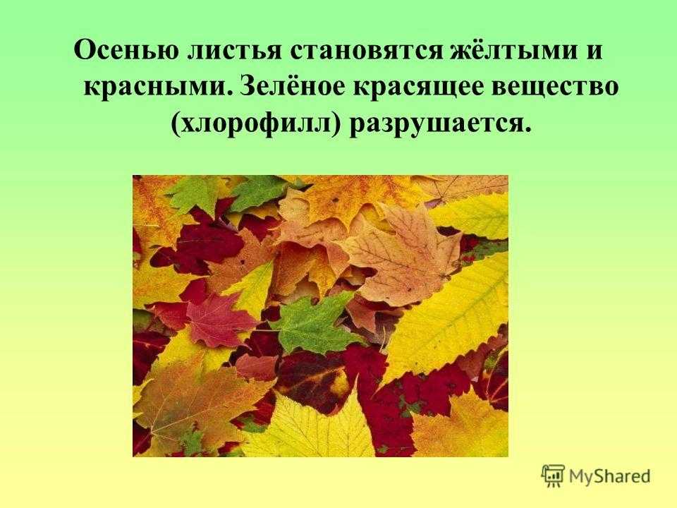 Осенью листья становятся жёлтыми и красными. Зелёное красящее вещество (хлорофилл) разрушается.