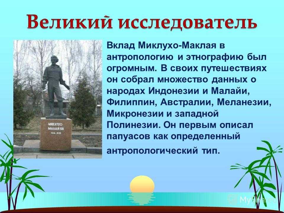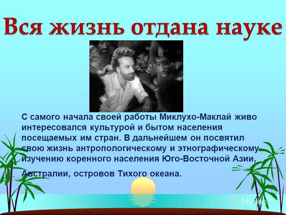 При изучении темы «Миклухо-Маклай Николай Николаевич» мы познакомились с краткой биографией выдающегося естествоиспытателя. Узнали, что открыл Миклухо-Маклай Николай Николаевич, и какую роль сыграли его открытия в развитии этнографии, антропологии, географии и многих других наук.
