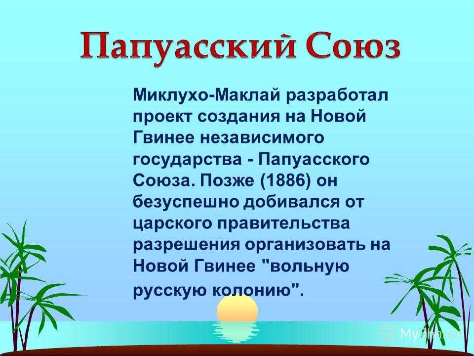 Миклухо-Маклай разработал проект создания на Новой Гвинее независимого государства — Папуасского Союза. Позже (1886) он безуспешно добивался от царского правительства разрешения организовать на Новой Гвинее «вольную русскую колонию».