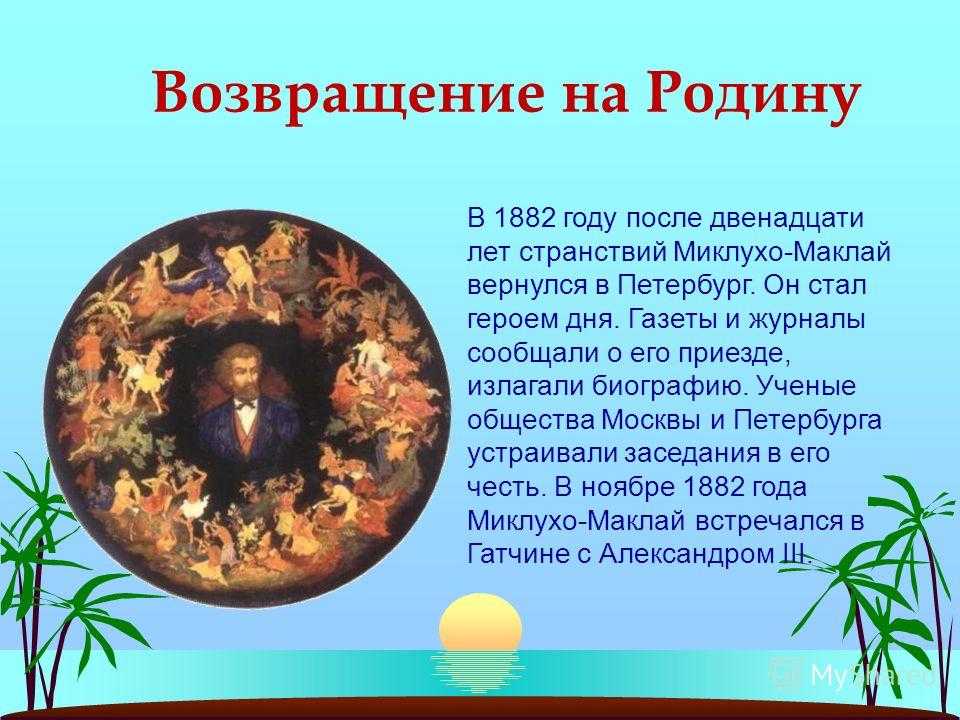 Возвращение на Родину В 1882 году после двенадцати лет странствий Миклухо-Маклай вернулся в Петербург. Он стал героем дня. Газеты и журналы сообщали о его приезде, излагали биографию. Ученые общества Москвы и Петербурга устраивали заседания в его честь. В ноябре 1882 года Миклухо-Маклай встречался в Гатчине с Александром III.