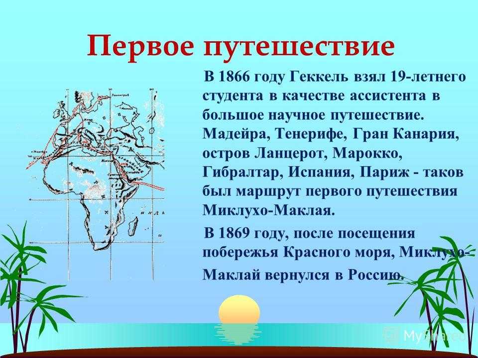 Первое путешествие В 1866 году Геккель взял 19-летнего студента в качестве ассистента в большое научное путешествие. Мадейра, Тенерифе, Гран Канария, остров Ланцерот, Марокко, Гибралтар, Испания, Париж — таков был маршрут первого путешествия Миклухо-Маклая. В 1869 году, после посещения побережья Красного моря, Миклухо- Маклай вернулся в Россию.