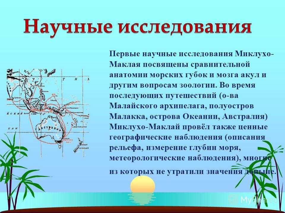 Первые научные исследования Миклухо- Маклая посвящены сравнительной анатомии морских губок и мозга акул и другим вопросам зоологии. Во время последующих путешествий (о-ва Малайского архипелага, полуостров Малакка, острова Океании, Австралия) Миклухо-Маклай провёл также ценные географические наблюдения (описания рельефа, измерение глубин моря, метеорологические наблюдения), многие из которых не утратили значения доныне.