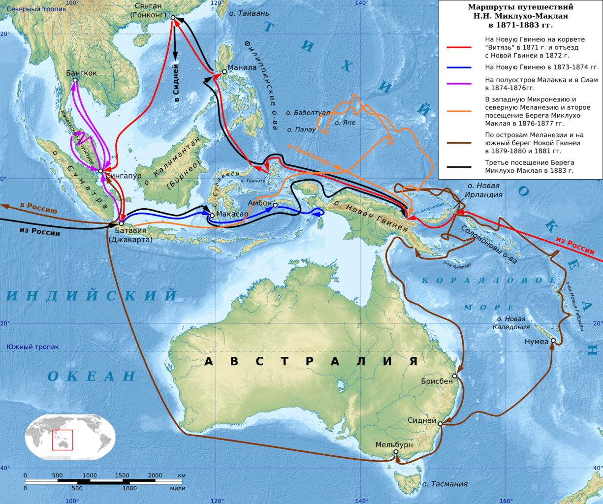 Карта с маршрутами экспедиций Н.Н. Миклухо-Маклая в Австралии, Океании и Юго-Восточной Азии. Изображение: Kaidor / Wikimedia Commons