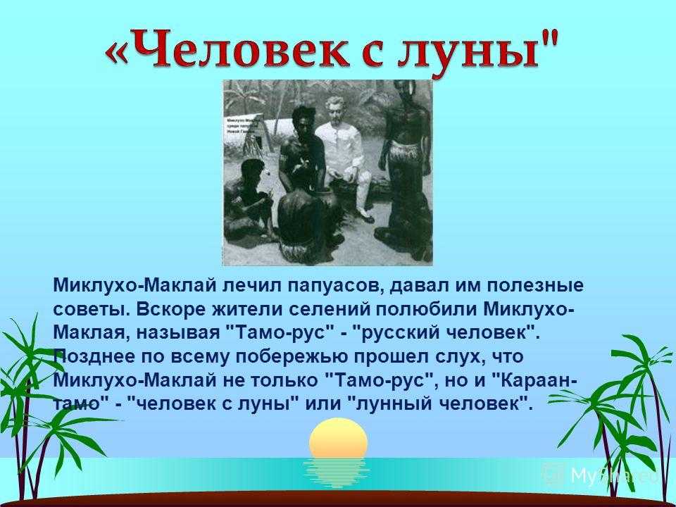 Миклухо-Маклай лечил папуасов, давал им полезные советы. Вскоре жители селений полюбили Миклухо- Маклая, называя «Тамо-рус» — «русский человек». Позднее по всему побережью прошел слух, что Миклухо-Маклай не только «Тамо-рус», но и «Караан- тамо» — «человек с луны» или «лунный человек».