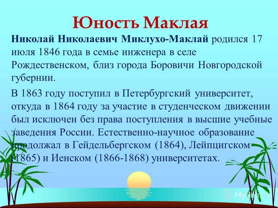 Юность Маклая Николай Николаевич Миклухо-Маклай родился 17 июля 1846 года в семье инженера в селе Рождественском, близ города Боровичи Новгородской губернии. В 1863 году поступил в Петербургский университет, откуда в 1864 году за участие в студенческом движении был исключен без права поступления в высшие учебные заведения России. Естественно-научное образование продолжал в Гейдельбергском (1864), Лейпцигском (1865) и Иенском ( ) университетах.