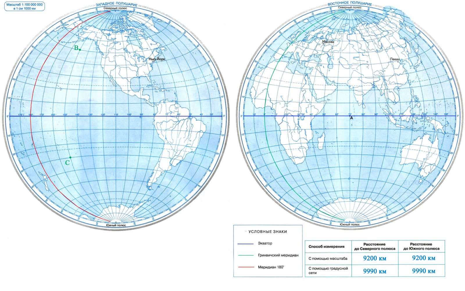 3. Используя масштаб карты и длину дуги одного градуса меридиана, определите расстояния от точки А до Северного и Южного полюсов. Внесите результаты в таблицу.