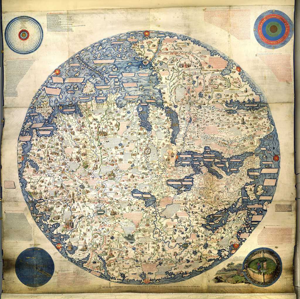 Кто-то называет XV век Поздним Средневековьем, кто-то — Ранним Возрождением. И этот разброс в понятиях отлично иллюстрирует переходность эпохи: традиция еще господствовала, но внутри нее пробивали себе дорогу новые веяния. В картографии этот тренд отразился в масштабной (2,4x2,4 м) карте Фра Мауро — венецианского монаха, создавшего ее по заказу португальского короля Афонсу V.