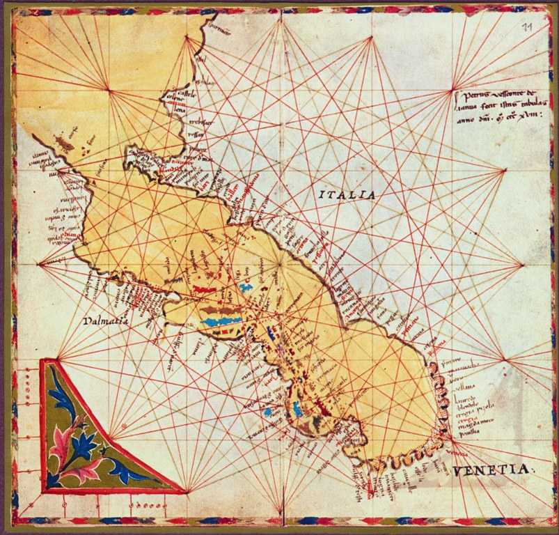 В XIV веке западноевропейская картография начинает меняться. Мореплавание было на подъеме, прибрежные города Испании и Италии процветали, поэтому понадобились более точные и удобные в использовании карты — портуланы (рубеж XIII–XIV веков). На них появилась сетка линий для ориентирования (румбов), которая соответствовала делению катушки компаса на 16 основных направлений. С их помощью мореплаватели определяли курс.