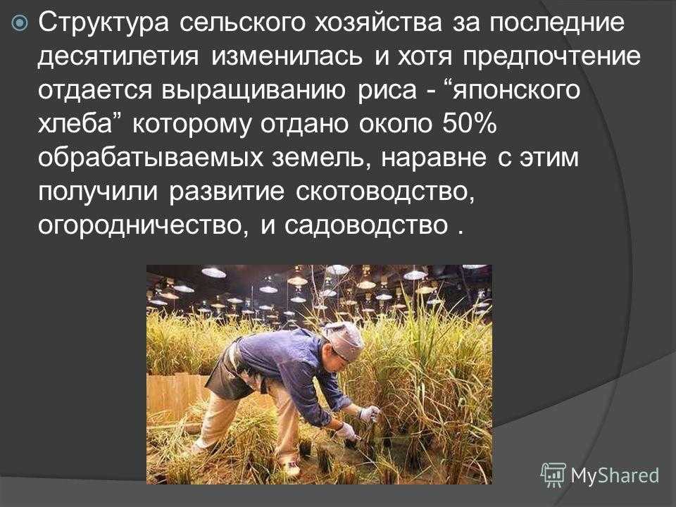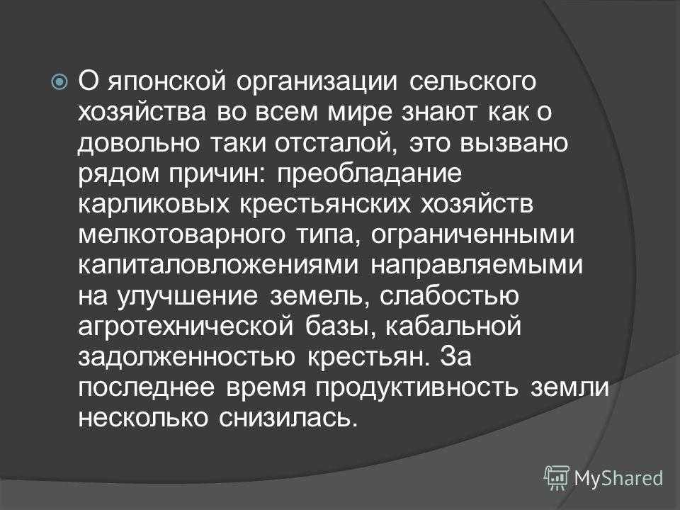 О японской организации сельского хозяйства во всем мире знают как о довольно таки отсталой, это вызвано рядом причин: преобладание карликовых крестьянских хозяйств мелкотоварного типа, ограниченными капиталовложениями направляемыми на улучшение земель, слабостью агротехнической базы, кабальной задолженностью крестьян. За последнее время продуктивность земли несколько снизилась.
