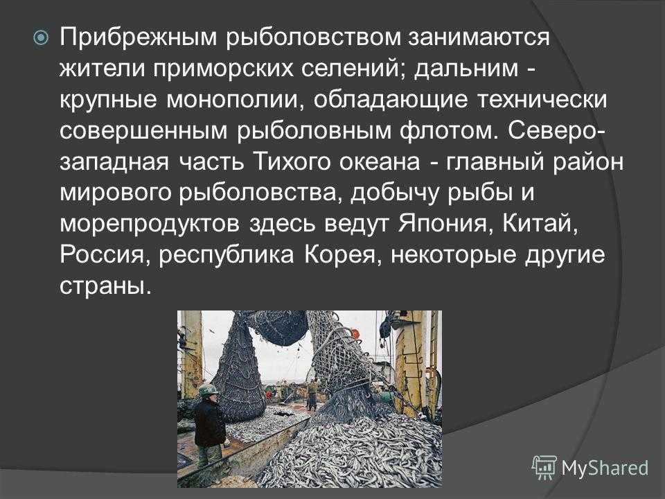 Прибрежным рыболовством занимаются жители приморских селений; дальним — крупные монополии, обладающие технически совершенным рыболовным флотом. Северо- западная часть Тихого океана — главный район мирового рыболовства, добычу рыбы и морепродуктов здесь ведут Япония, Китай, Россия, республика Корея, некоторые другие страны.