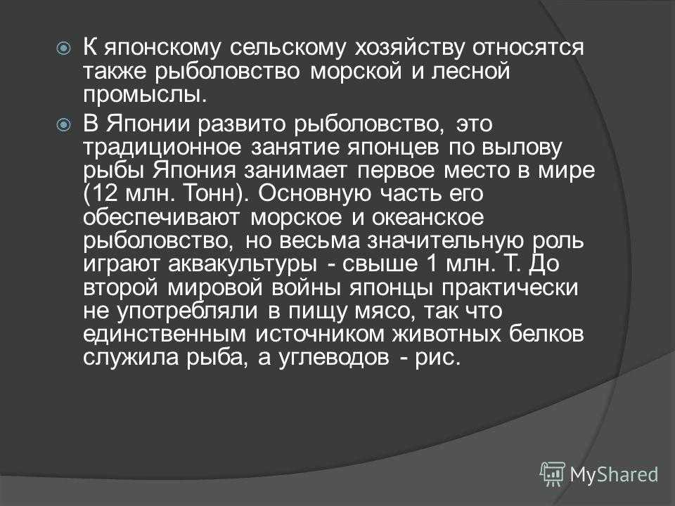 К японскому сельскому хозяйству относятся также рыболовство морской и лесной промыслы. В Японии развито рыболовство, это традиционное занятие японцев по вылову рыбы Япония занимает первое место в мире (12 млн. Тонн). Основную часть его обеспечивают морское и океанское рыболовство, но весьма значительную роль играют аквакультуры — свыше 1 млн. Т. До второй мировой войны японцы практически не употребляли в пищу мясо, так что единственным источником животных белков служила рыба, а углеводов — рис.